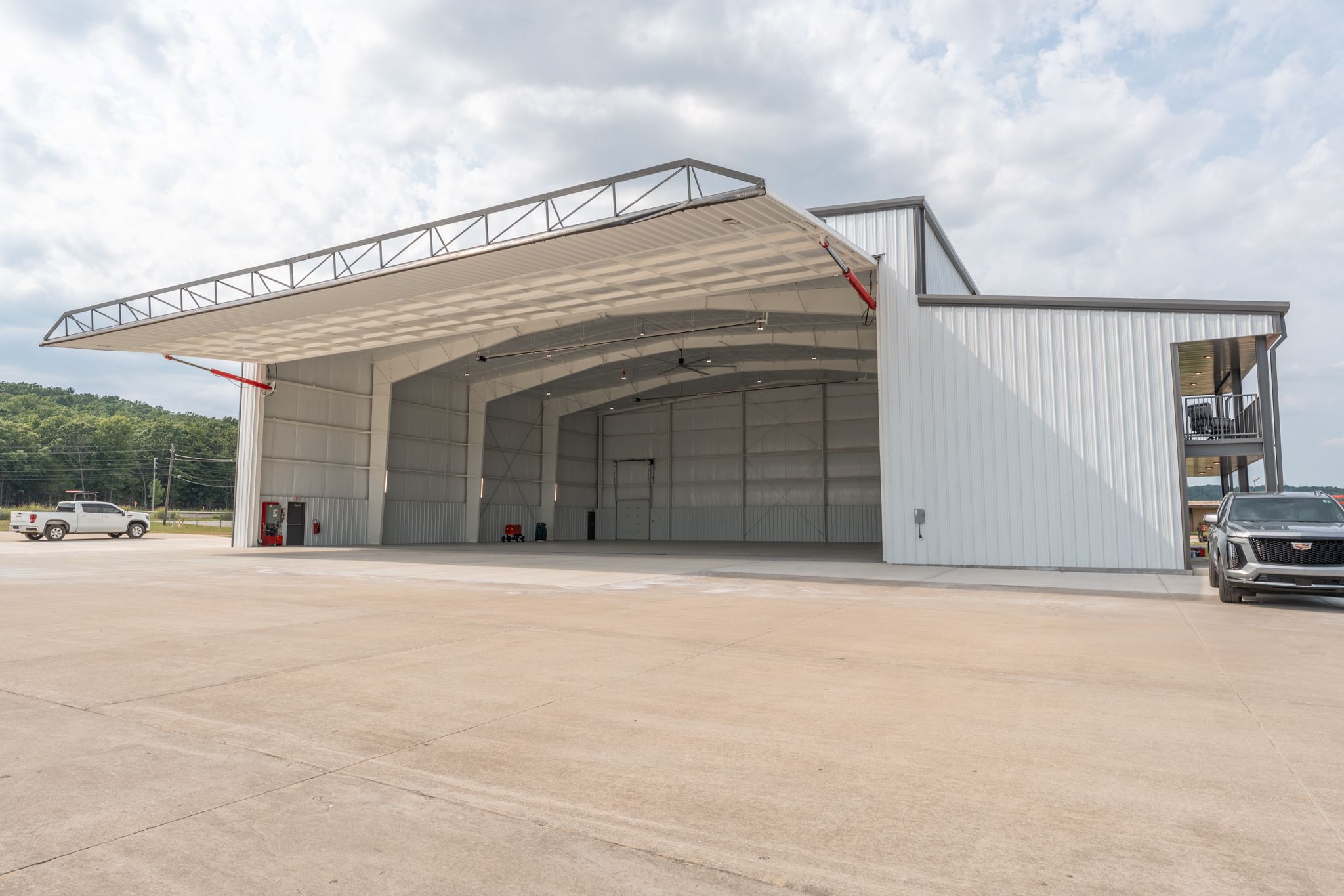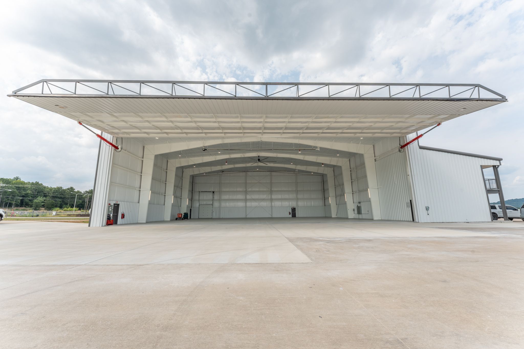 Aviation hangars present unique coating challenges: high ceilings, open-bay geometry, and FAA-adjacent safety requirements. Our crew applied dryfall ceiling paint — a specialty coating designed to dry before reaching the floor, protecting aircraft and equipment during application. The exterior received a multi-coat industrial coating system engineered for the extreme temperature cycling that metal structures experience in NWA climate.